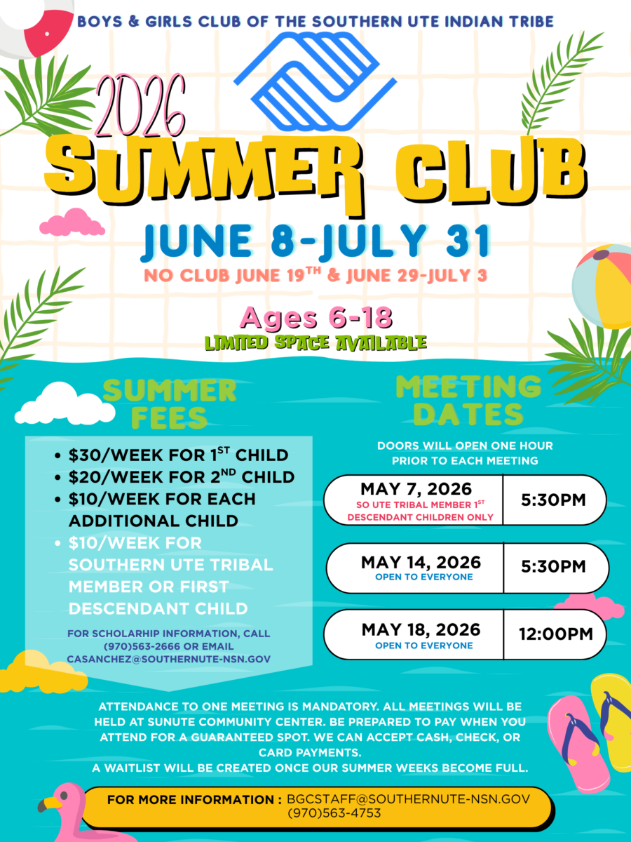 The Boys and Girls Club of the Southern Ute Indian Tribe will provide a safe and nurturing environment that guides each young person on their path to developing good character, respect of culture, diversity, academic excellence and development of a healthy mind, body and spirit.